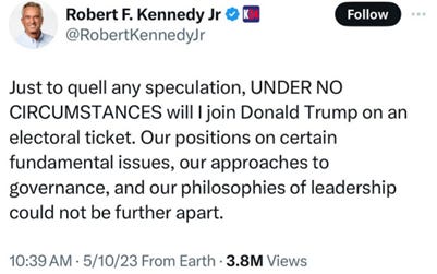 Because, to be clear, Bobby is not just—excuse me, not even dropping out of the race. He could have done that, correctly denouncing the Democratic party’s anti-democratic legal and electoral tactics that made it impossible for his campaign to compete within the party or as a third party, and, indeed, denouncing the whole duopoly-enforced structure of American electoral politics that makes it impossible for any non-duopoly candidate to succeed. If he were really interested in building the possibility of a progressive third party, he could have stuck with his very recent critique of how “President Biden[/Harris], President Trump offer no solutions” and ended his campaign without transferring allegiance to either of the duopoly parties or candidates. He could have approached Jill Stein—as he apparently did both Kamala and Trump—and tried to negotiate agreements on highlighting issues that were important to him in return for urging his supporters to vote for her.