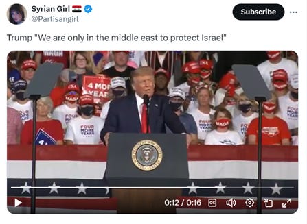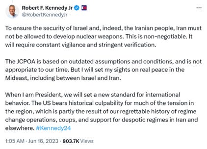 Anyone who, like RFK Jr., demands “unwavering, resolute, and practical action” to support the Zionist colonial project, who renounces the JCPOA and decrees that Israel must but Iran must not have nuclear weapons, and pledges to “provide Israel with whatever it needs to defend itself.. throughout this operation [the Gaza genocide] and beyond,” is someone who is supporting Israel’s constant aggressions against its neighbors Syria and Lebanon, and will support the attack on Iran that is the next and most dangerous “forever war” on the agenda. It’s a war that is Israel’s solution to the existential problem the Zionist project confronts in Gaza—a war Israel is determined, and has been planning since the Trump administration, to get us into.