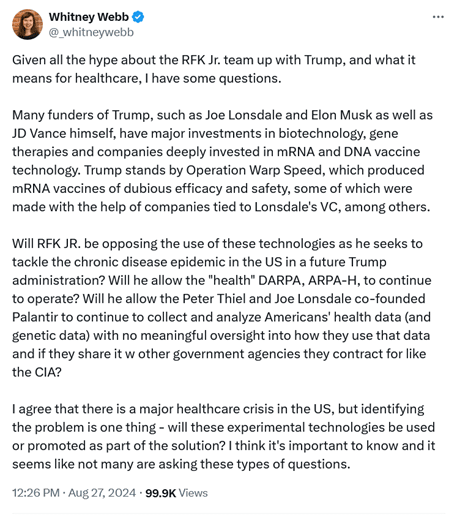 Many funders of Trump, such as Joe Lonsdale and Elon Musk as well as JD Vance himself, have major investments in biotechnology, gene therapies and companies deeply invested in mRNA and DNA vaccine technology. Trump stands by Operation Warp Speed, which produced mRNA vaccines of dubious efficacy and safety, some of which were made with the help of companies tied to Lonsdale's VC, among others.