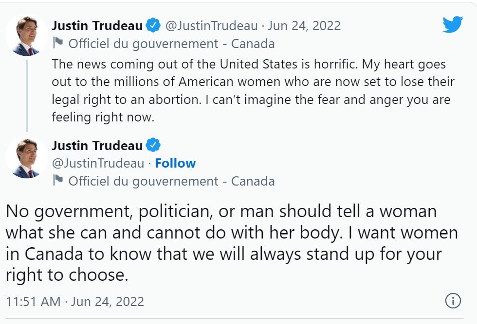 I repeat: Justin Trudeau (or Gavin Newsom) preventing women from entering his polity to get an abortion is no better than some Republican governor preventing women from leaving his. There is no way to fudge on that that does not weaken the abortion-rights movement.
