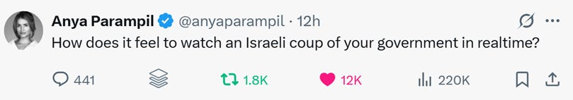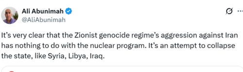 It is indeed a regime-change operation against Iran, and its entire point—the only thing about the regime that has to change—Is for Iran to accept the Zionist project, which means, abandoning support for Palestinian liberation, accepting Israel as the unchallenged regional hegemon, and ridding itself of any military capacity that would allow effective resistance to any aggression, including against the Palestinians, that Israel might wish to undertake.