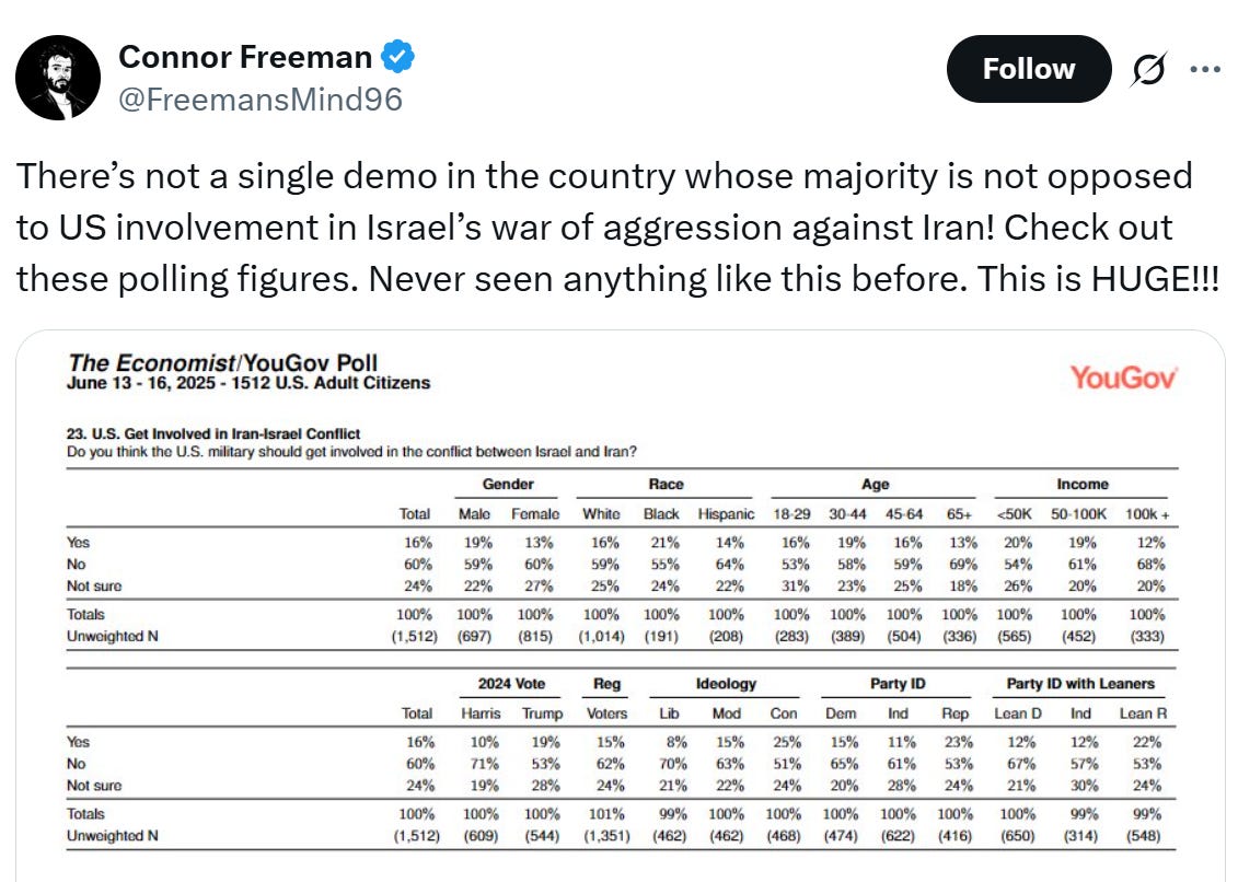 It’s shameful for those of us on the left that the stirrings of such a revolt come from elements of the MAGA base who are bristling about Trump’s betrayal of “America First,” “No More Regime Change Wars” promises, and/or from Pentagon generals giving a realistic assessment of the military situation. (Certainly not from the Democrats.) It was Tucker Carlson and “senior Pentagon officials” who led Trump to call off the attack on Iran he ordered in 2019. But this time, with Israel having gone all in and under fire, I do not believe Trump, who’s already smacked down “kooky” Tucker, will resist the Zionist pressure he has built up around him since then. To paraphrase Macgregor: Netanyahu controls more of Donald Trump than does the MAGA base.